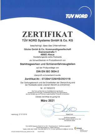 Die TÜV CERT-Zertifizierungsstelle der RW-TÜV Anlagentechnik GmbH bescheinigt gemäß TÜV CERT-Verfahren, dass das Unternehmen Göcke GmbH & Co KG in Ahaus für den Geltungsbereich ein Qualitätsmanagement eingeführt hat.